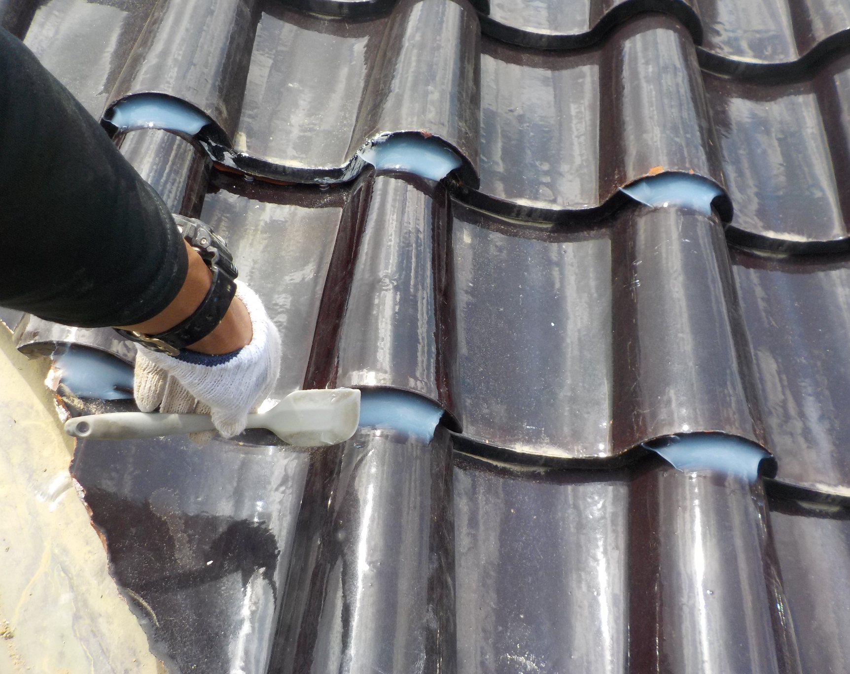 ④新しい瓦を乗せ、交換した瓦とその周辺の瓦をボンドで止めます。(コーキング)